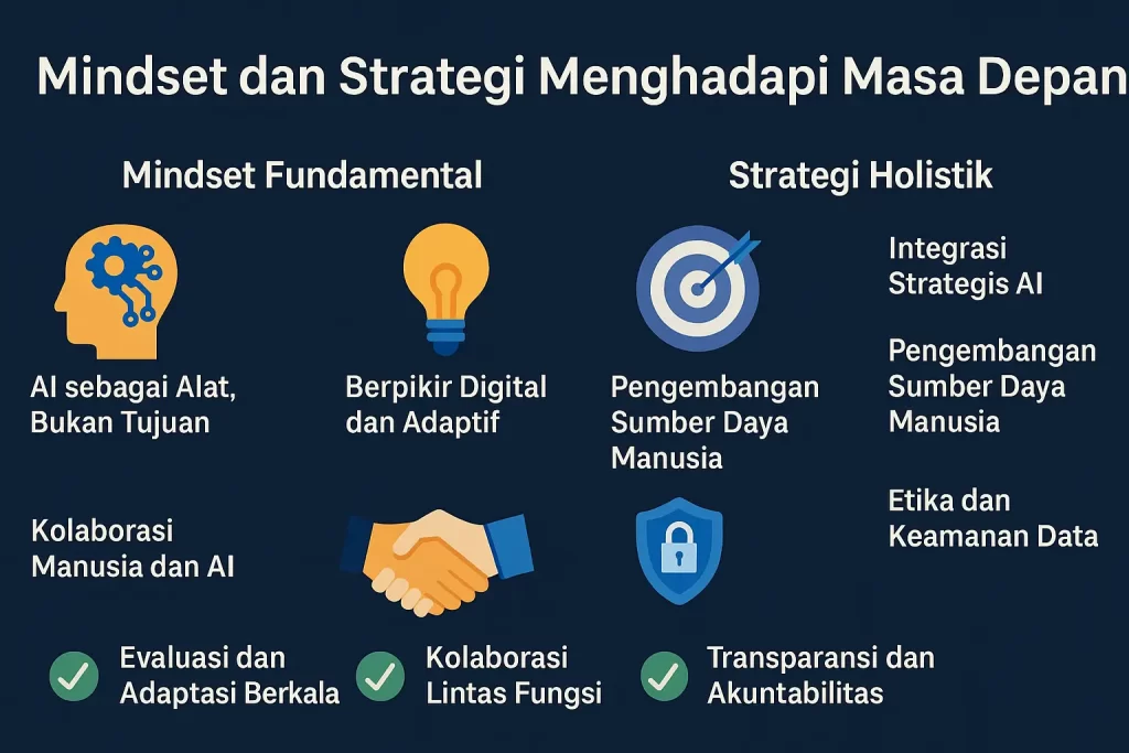 Dunia bisnis pada 2025 menuntut keseimbangan antara kecepatan teknologi dan sentuhan manusia. Mindset yang melihat AI sebagai alat, berpikir digital dan adaptif, serta kolaborasi manusia-AI membentuk fondasi kokoh. Di sisi lain, integrasi strategis, pengembangan SDM, dan etika data menjawab kebutuhan operasional. Prinsip keberlanjutan memastikan langkah kita tahan uji waktu.